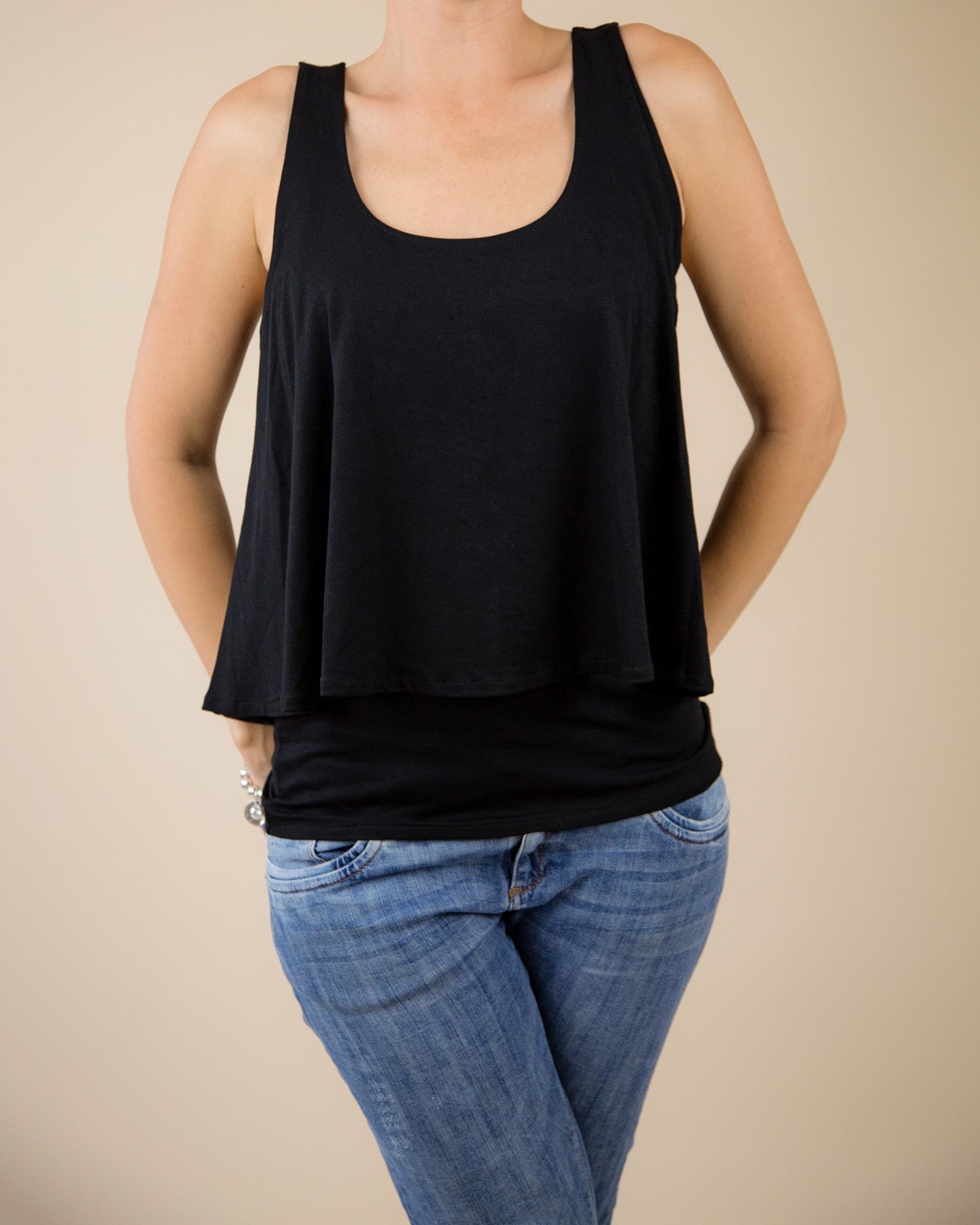 A new innovative design- comprising of two layers- vest under layer to keep tummy hidden and a floaty, strappy over layer, to keep feeding mamas little secret.